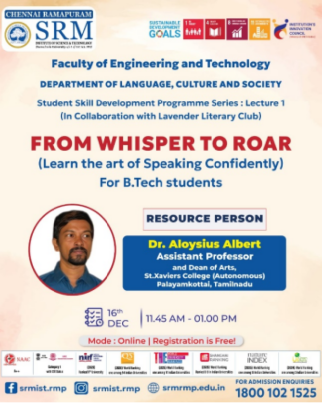 EVENT REPORT16.12.2025 The Department of Language, Culture and Society, SRM Institute of Science and Technology, Ramapuram, in collaboration, with Lavender Literary Club, Kanyakumari, Development organized a Student Programme in online mode for B Tech students on 16.12.2025, to help the students overcome hesitation and fear, making them confident in speaking. It began with awelcome address…